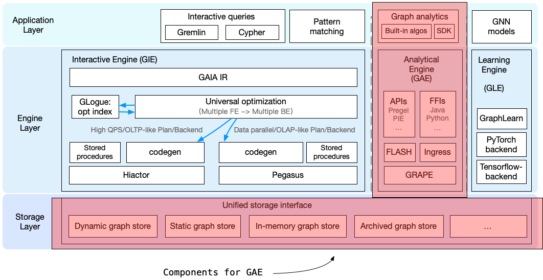 The foundation of the engine layer in GAE is GRAPE, which offers core functions for graph analytics, including accessing vertices/edges of a sub-graph (fragment), visiting property data of vertices/edges, state synchronization between different fragments, and intermediate data management. Meanwhile, GRAPE applies many graph-level optimizations, such as indexing, compression, dynamic push/pull switching, pipelining, and load balancing, to achieve better performance. For more details about these optimizations, please refer to this link.